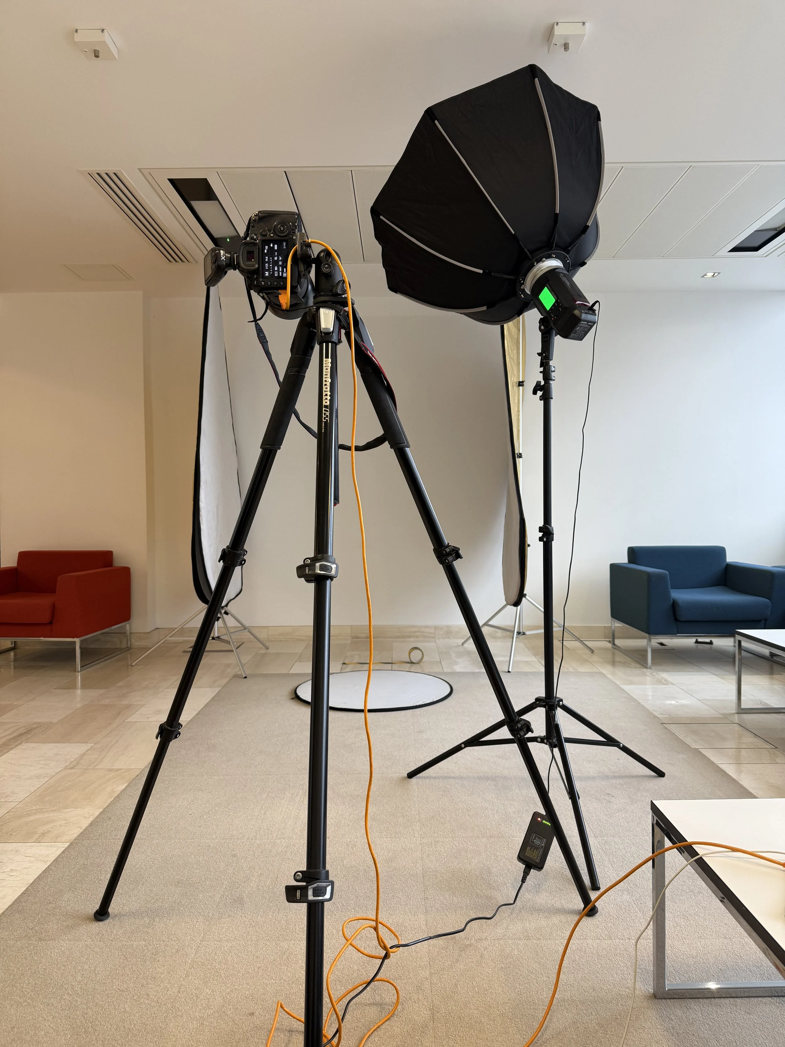 • Photography setup with a camera on a tripod, a large softbox light, and various cables in a modern lounge area with chairs and a carpet.
