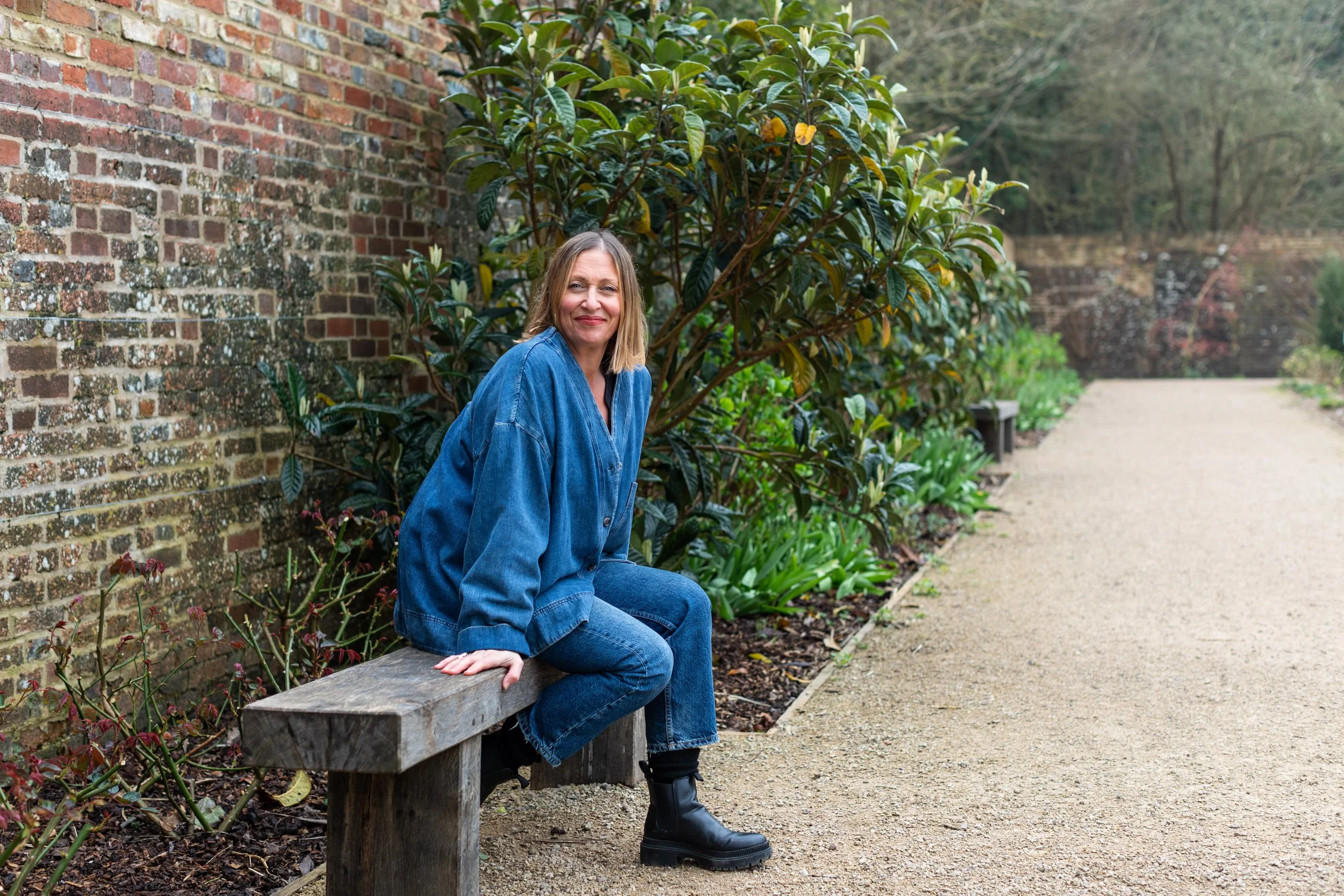 • A woman with blonde hair wearing a beige sweater and maroon pants is standing outside, holding a wooden tray with wooden bowls. She is smiling and looking to her left. Behind her, there is a black wooden wall with a large window reflecting trees and indoor lighting. There are green plants and a wicker basket on the ground nearby.